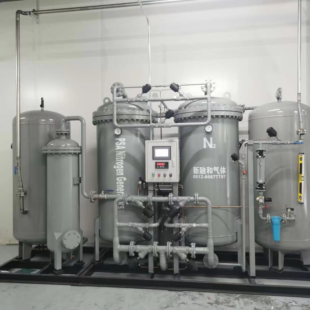 ??變壓吸附PSA制氮機(Pressure Swing Adsorption,簡稱PSA)是指以干凈的壓縮空氣為原料,利用物理的方法,按變壓吸附技術設計、制造的氮氣設備。制氮機以優質進口碳分子篩(CMS)為吸附劑,采用常溫下變壓吸附原理,分離空氣制取不同純度的氮氣。通常使用兩吸附塔并聯,由進口PLC控制進口氣動閥自動運行,交替進行加壓吸附和解壓再生,完成氮氧分離,獲得所需不同純度的氮氣。